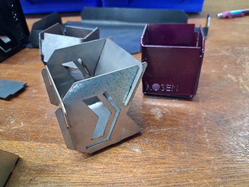 ここでは、私が担当したWorkshop(実習工場)での活動について紹介します。Workshopでは、設置されている工作機械や実習で用いる工具の説明をメカトロニクス学科の5年生が説明しました(写真3)。そして、メインイベントとして、レーザー加工機および水圧フォールディングマシンの実演を行い、実演で加工した部品を、来場者に組み立ててもらい、KOSEN-KMITLの校舎の形を模したペン立て(写真4)を完成させるという内容でした。