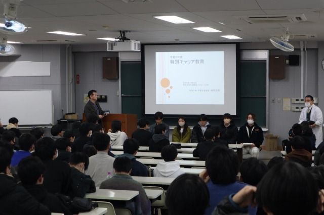 11月22日(水)、本校3年生を対象として特別キャリア教育講演会を開催しました。講演会前半では教務主事から進路の一つとして進学を考えてみませんかという内容の話がありました。