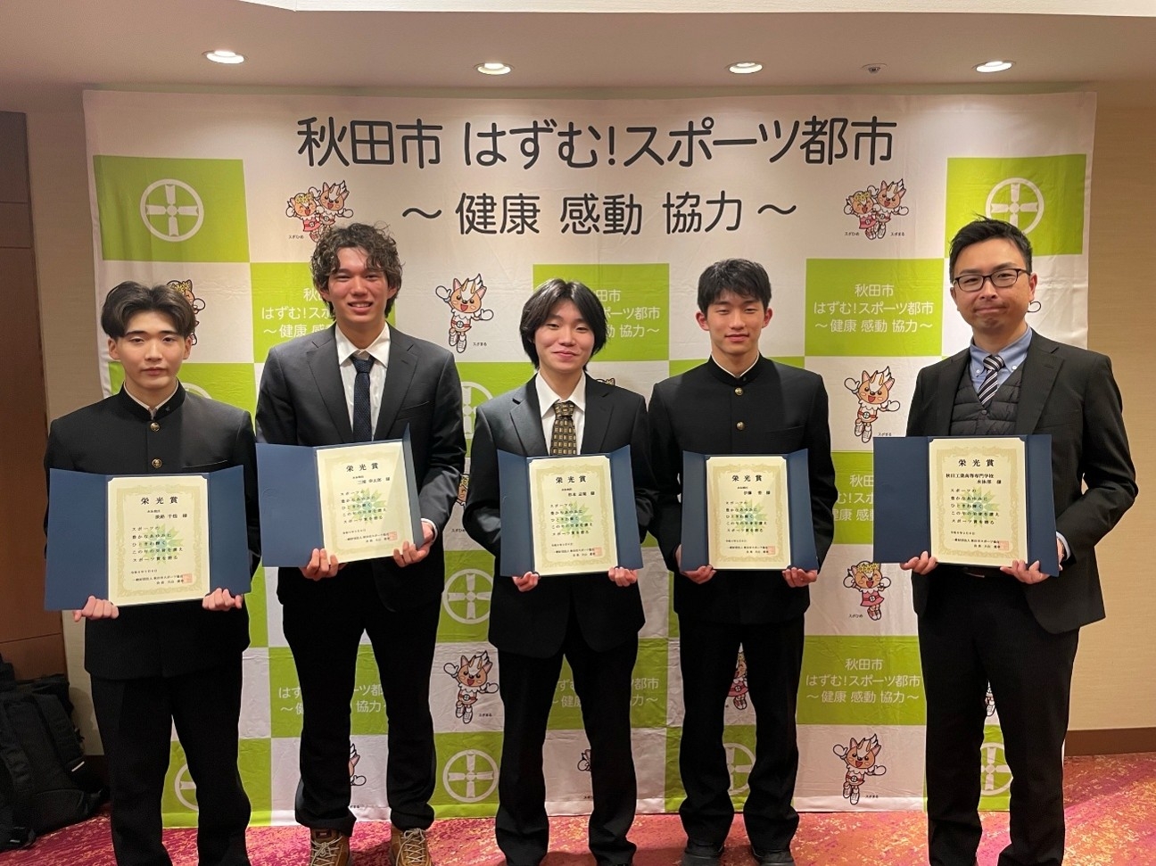 水泳部は第60回全国高等専門学校体育大会・第31回全国高等専門学校水泳競技大会で行われた男子4×100mフリーリレー(5E三浦幸太郎、5C杉本志琉、2M伊藤碧、2C淡路千煌)において全国3位に入賞しました。リレーでの全国大会入賞は創部始まって以来の快挙となります。このたびその功績が認められ、令和7年度秋田市スポーツ賞表彰式において栄光賞が授与されました!